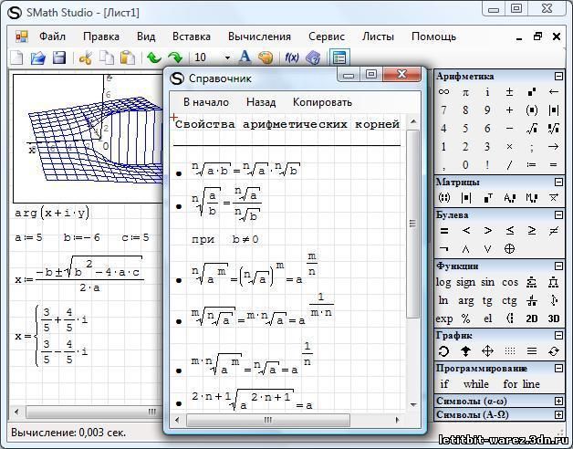 Бесплатный математический пакет с графическим интерфейсом для вычисления математических выражений и построения двумерных и трёхмерных графиков. Поддерживает работу с матрицами, векторами, комплексными числами, дробями и алгебраическими системами. Удобный, графический (как на бумаге) интерфейс и богатые вычислительные возможности программы хорошо сочетаются с достойным количеством настроек и автоматических режимов. В дистрибутив программы также встроен информативный математический справочник.