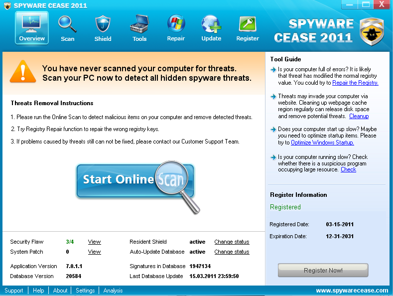 Spyware Cease - анти-троянская программа для защиты вашего компьютера от шпионских атак, которые могут вызвать нежелательные всплывающие окна, замедлить производительность вашего ПК или "снять" с системы какую-либо секретную информацию, без вашего ведома, в виде паролей доступа, номеров кредитных карт и т.п. С помощью данной программы вы сможете защитить ваш ПК от различных шпионских модулей.